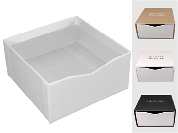 Æsken er overtrukket med hvidt blankt papir og leveres med et hvidt velouriseret skumindlæg, velegnet til armbånd.